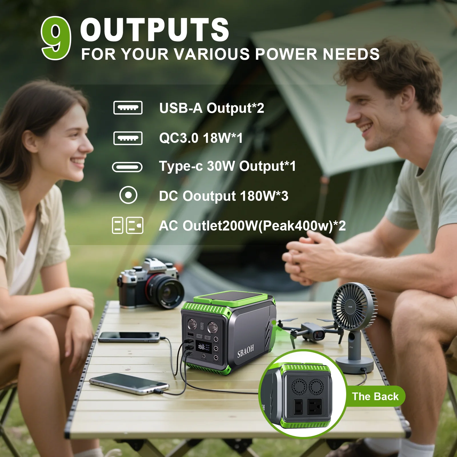 · 9The device can be charged at the same time, 2× 400W AC port (peak), PD30W Type-C QC18W fast charging, 3× 12V DC port, and charging laptop/ventilator/mobile phone group at the same time.